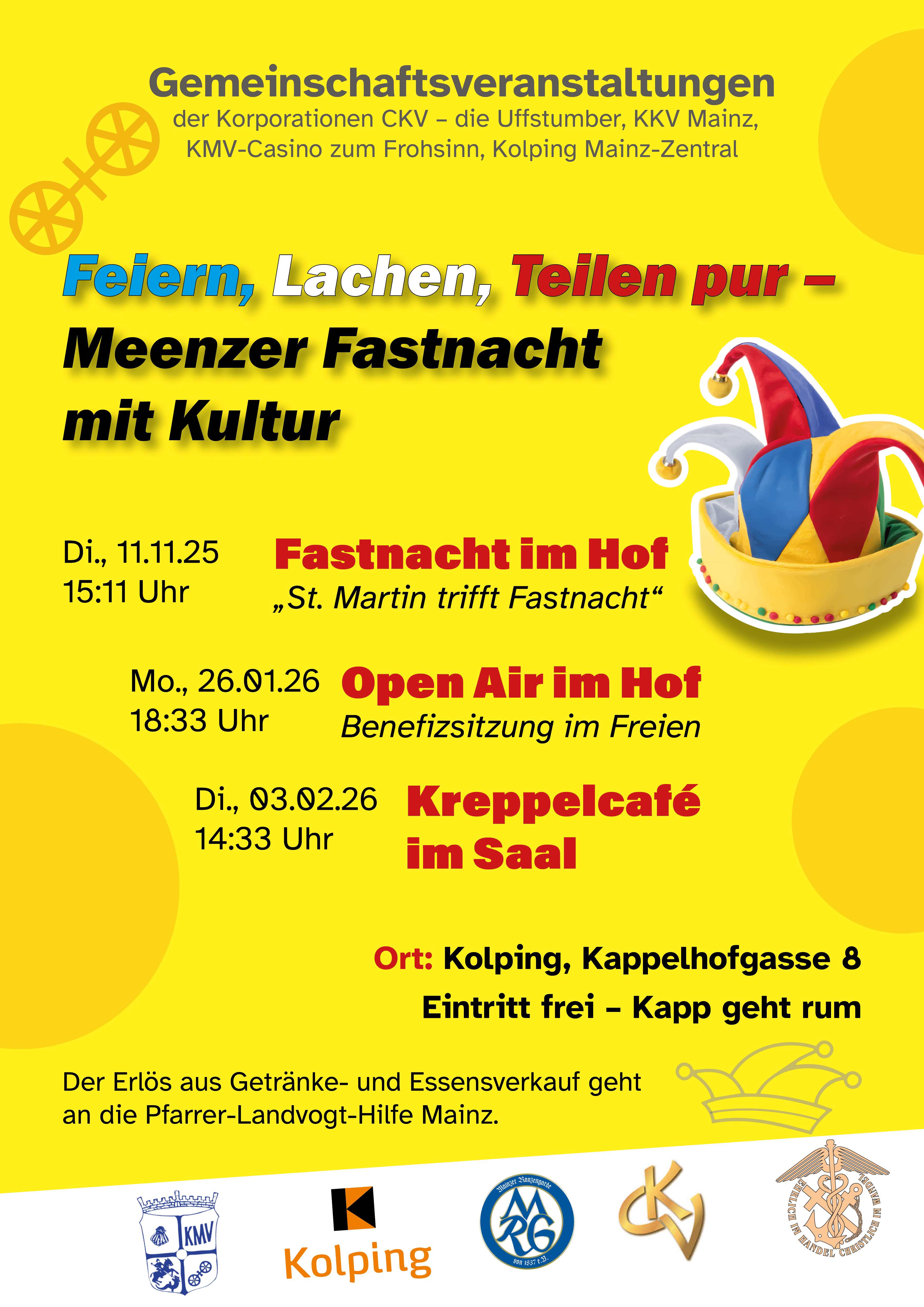Am Dienstag, den 03. Februar 2026, laden wir euch herzlich zu unserem Kreppelcafé im Saal des Kolpinghauses Mainz ein. Genießt einen gemütlichen Nachmittag in geselliger Runde und guter Stimmung.