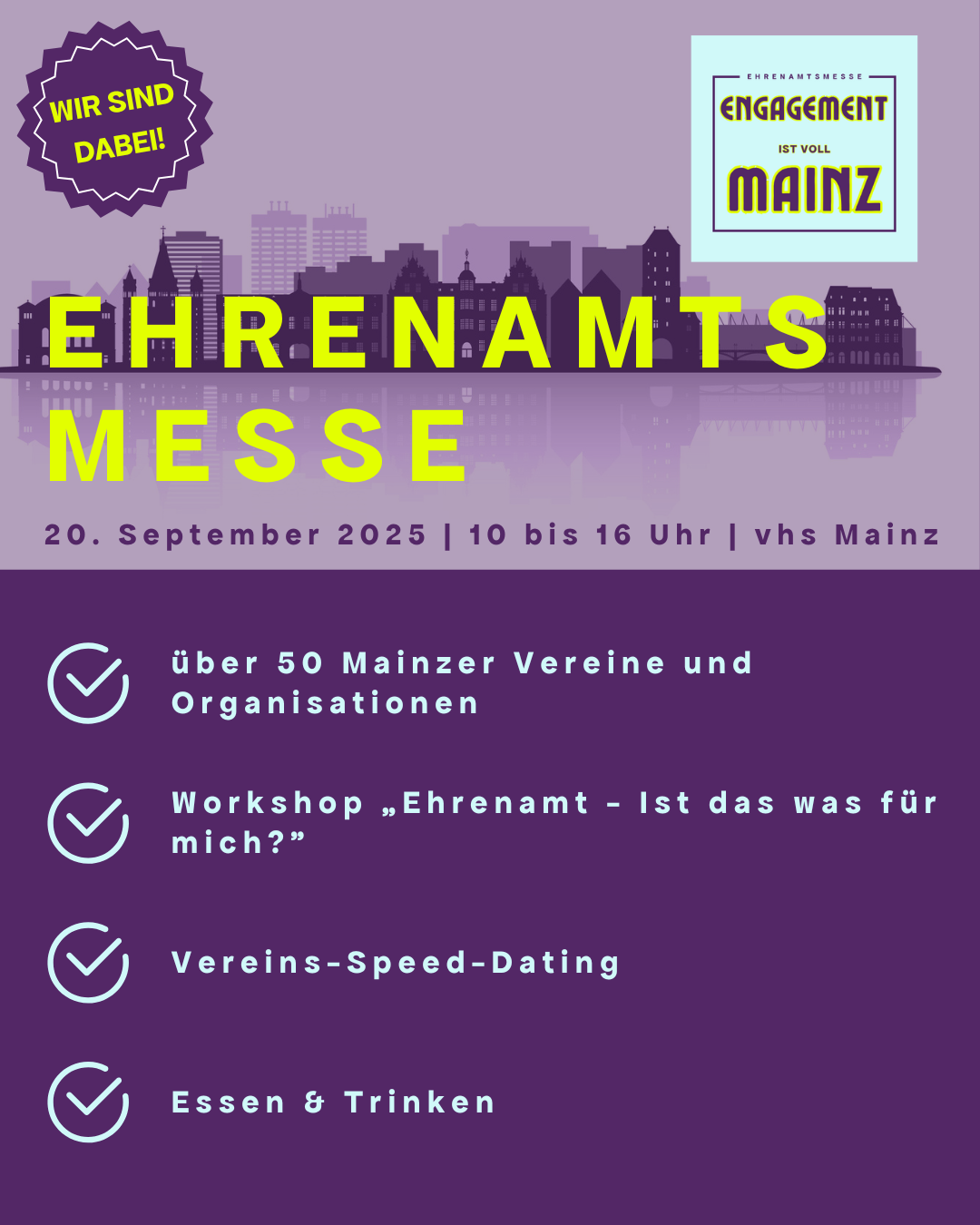 Am 20.09.2025 von 10–16 Uhr findet in der vhs Mainz die erste Mainzer Ehrenamtsmesse „Engagement ist voll MAINZ“ statt – und wir sind mit einem Stand vertreten! 💪✨
