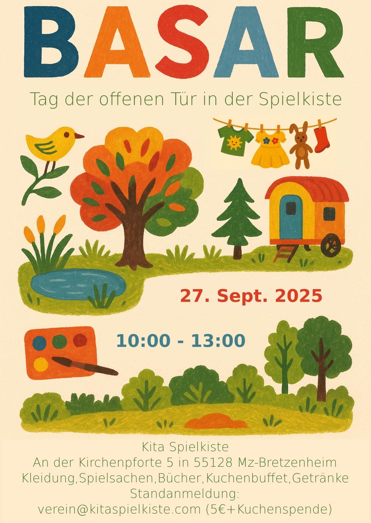 Am Samstag, den 27. September von 10:00 - 13:00 Uhr lädt die Kita Spielkiste zum Tag der offenen Tür und zum Basar in unserer Einrichtung ein!