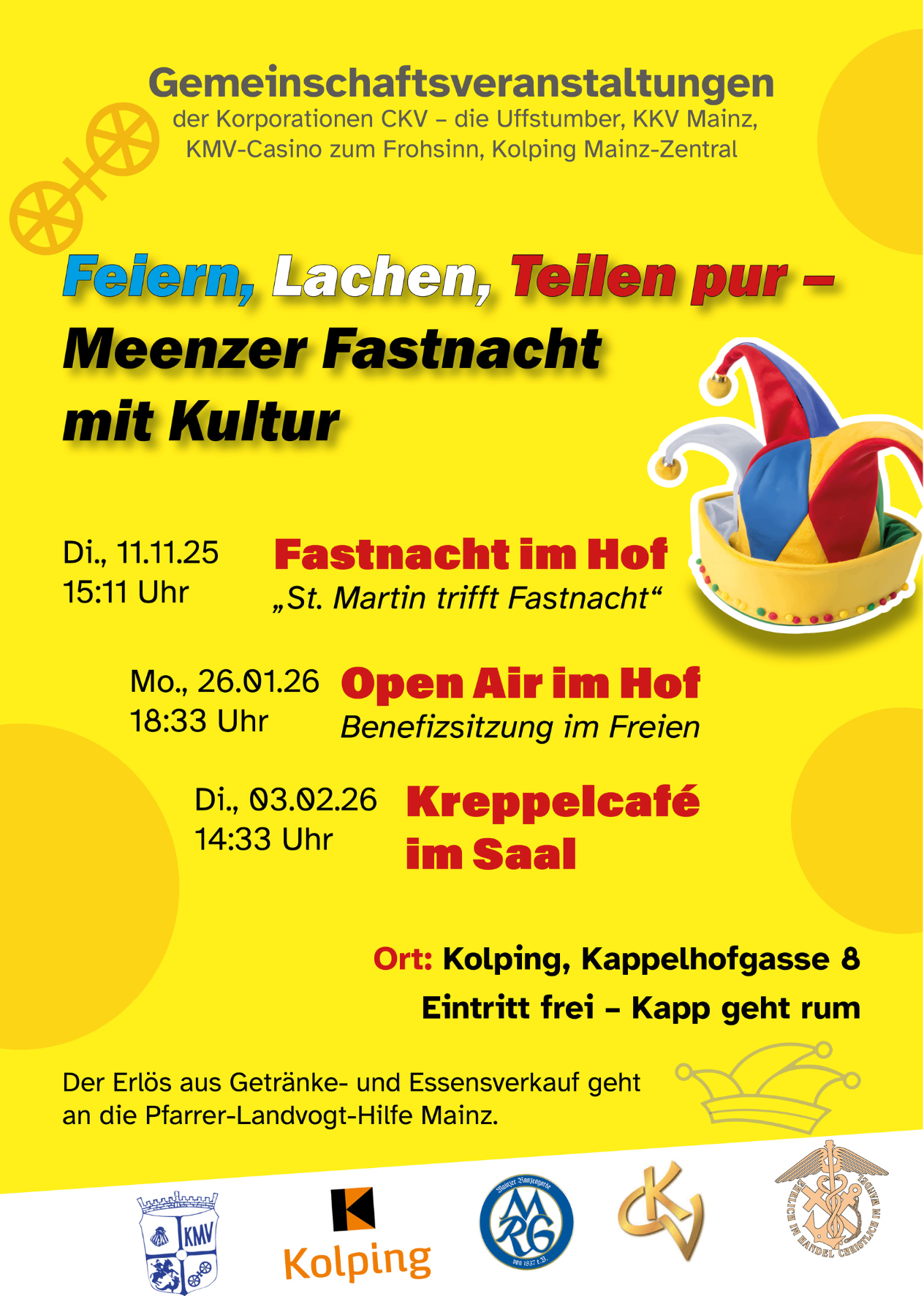 Neu im Veranstaltungsreigen sind Gemeinschaftstermine für den guten Zweck mit dem KKV, dem KMV und Kolping Mainz-Zentral in der Mainzer Altstadt im Kolping-Haus. Am Montag, 26.01.2026, steigt um 18.33h ein Open Air im Hof, am Dienstag, 03.02.2026, ein Kreppelcafé um 14.33h im Saal. Für diese beiden Veranstaltungen ist der Eintritt frei.